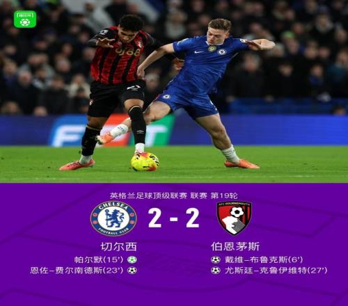 北京时间12月31日英格兰足球顶级联赛 联赛 第19轮,切尔西主场对阵伯恩茅斯。上半场,布鲁克斯率先破门。埃斯特旺造点,帕尔默点射扳平比分。加纳乔助攻,恩佐劲射建功。随后,小克鲁伊维特为客队扳平比分。下半场,两队均无建树。全场比赛结束,切尔西2-2战平伯恩茅斯,遭遇英超联赛3轮不胜。
