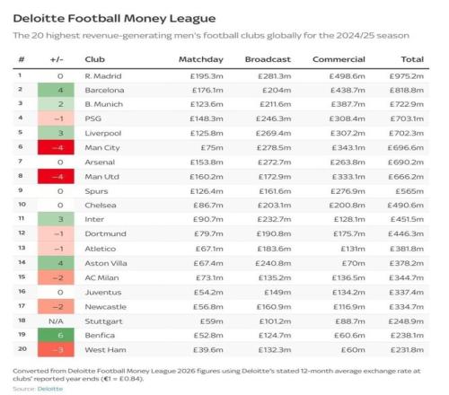 The Athletic:曼联在2024/25赛季德勤财富榜(Deloitte Football Money League)的收入排名中跌至第8位,之前一个赛季,红魔在该榜单排名第4。