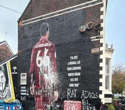 战皇马赛前阿诺德壁画被破坏,旁边写着“老鼠”和“再见”